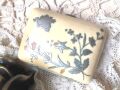 アイボリーでできた可愛らしいピルケースです。象牙を粉にし成型したもので、貝やピューターで植物の象嵌細工がされた手の込んだものです。今ではなかなか入手しにくい貴重なアイテムとなっています。中は荒削りな感じですが、布など敷いてアクセサリーを入れてもいいと思います。コレクションの一つとしてどうぞ。レターパック370円で発送いたします。<br>サイズ W4,6cm D6cm 厚み2,2cm