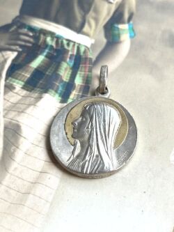 聖母マリアの大きめのメダイで後光に金彩が施されています。<br>手元に持っているだけでご利益がありそうなメダイです。<br>聖母マリアのメダイは数多く扱ってきましたが、あまり見かけず貴重だと思います。<br>ペンダントヘッドにどうぞ。<br>サイズ Φ2cm(ホール部分含まず)<br>普通郵便110円で発送いたします。
